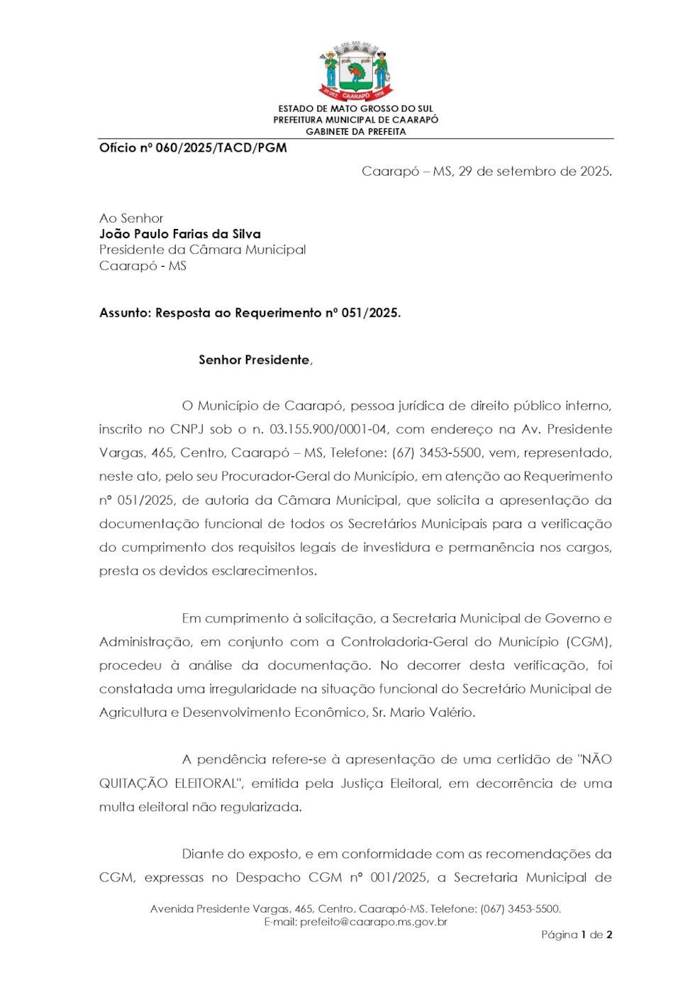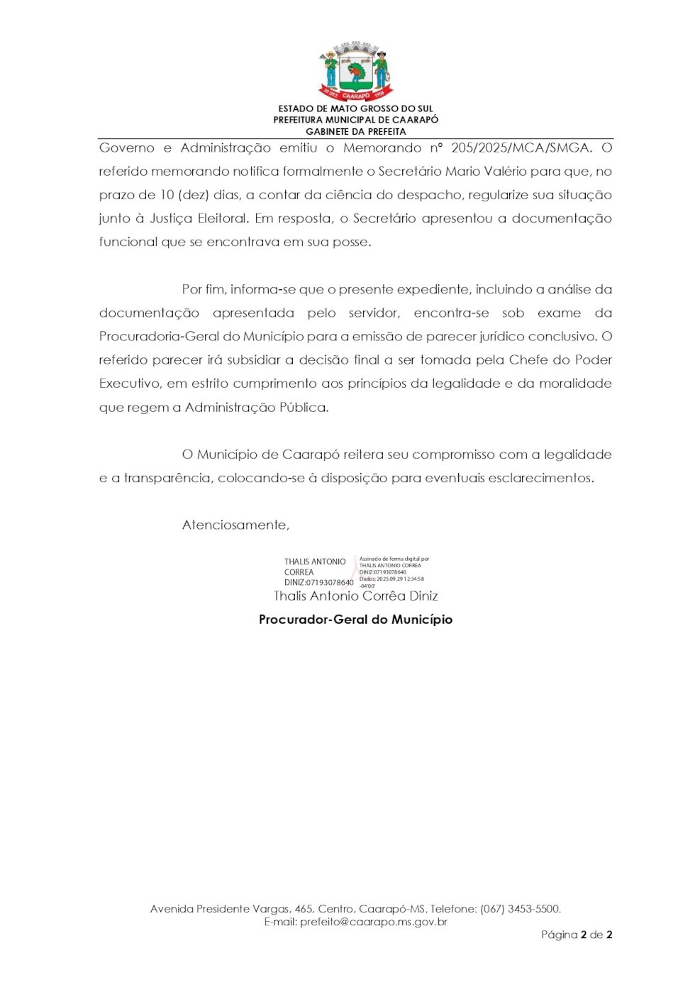 A análise jurídica do caso segue em andamento e a decisão final caberá à prefeita de Caarapó, com base no parecer da Procuradoria-Geral do Município.