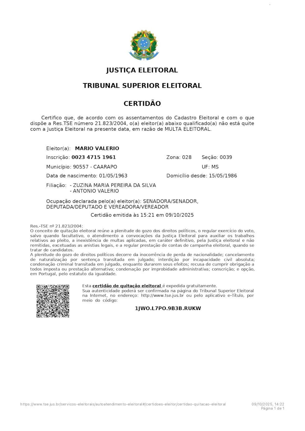 Em manifestação anexada ao processo, a defesa de Mário Valério esclareceu que o requerente possui em seu cadastro uma anotação de multa eleitoral decorrente da sentença da Ação de Investigação Judicial Eleitoral (AIJE) nº 0000204-59-2016.6.12.0002, que tramitou no juízo eleitoral da comarca de Caarapó.